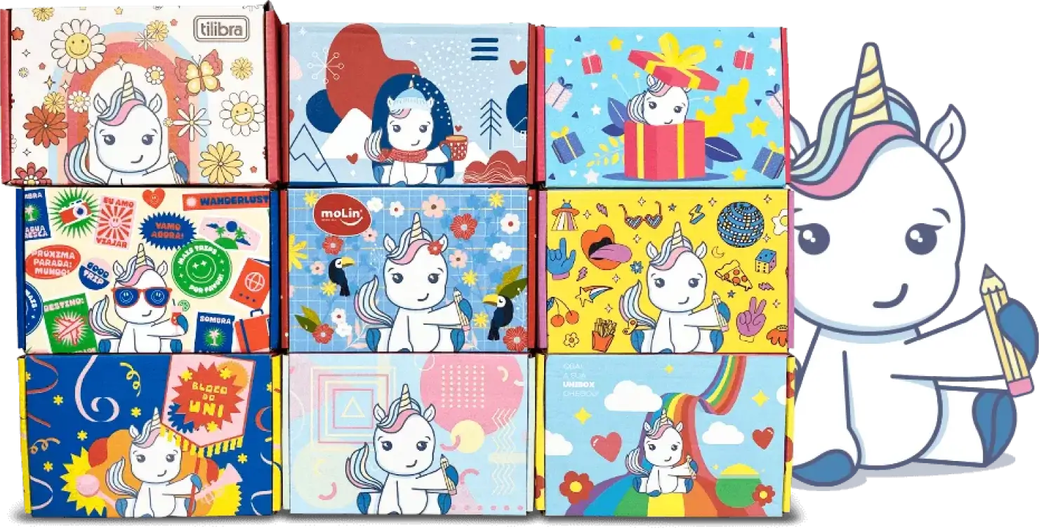 UNIBOX: Popular entre os assinantes, o plano Uni oferece uma experiência de 'recebidinho' mensal com uma caixa temática que contém itens de papelaria que valem no mínimo 15% a mais que o valor da assinatura. Este plano também inclui os mesmos benefícios do MiniUni.